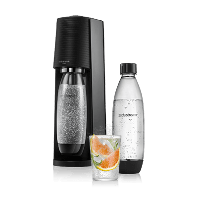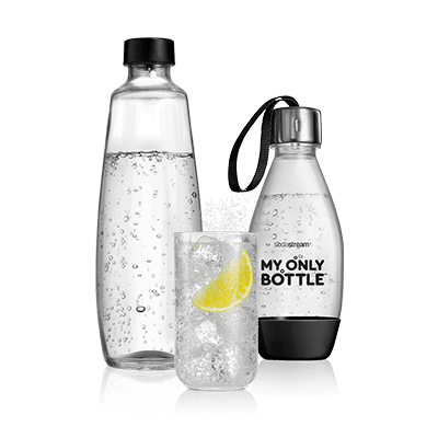 Add the strawberries, mint leaves and lemon pieces to a glass with ice. Fill the glass with sparkling water and top off with the SodaStream soda mix