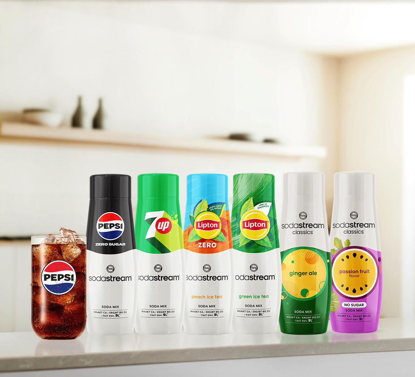 Discover the most beloved flavours in one irresistible bundle. This bestselling 6-pack brings together six crowd favourites that never fail to impress: Pepsi Zero, 7UP Zero, Lipton Ice Tea Peach Zero, Lipton Ice Tea Green, SodaStream Classics Ginger Ale, and SodaStream Classics Passion Fruit.