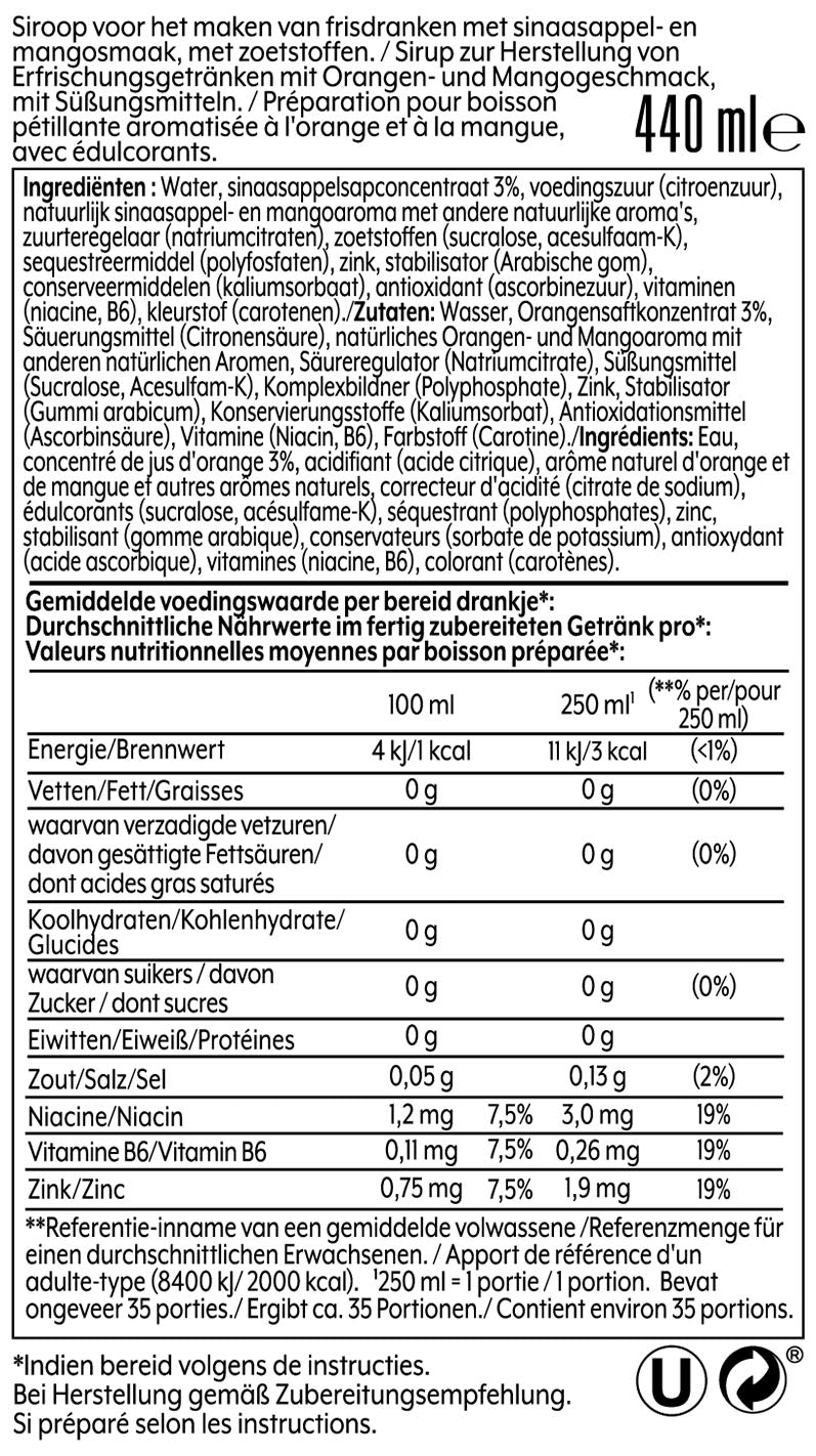 Discover the renewed recipe of the SodaStream Orange Mango Zero 6-pack. Give your sparkling water the delightful, fruity taste of orange and the tropical flavour of mango, enriched with an extra boost of vitamins and minerals. Completely sugar-free!