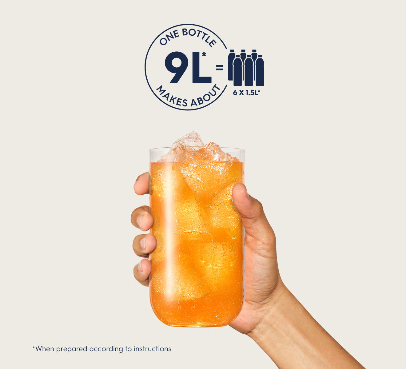 One bottle of SodaStream syrup makes up to 9 liters of sparkling water. All you need to do is add the right amount of syrup to sparkling water in a SodaStream bottle. Enjoy your favorite drink anytime! Nutritional information can be found in the table.