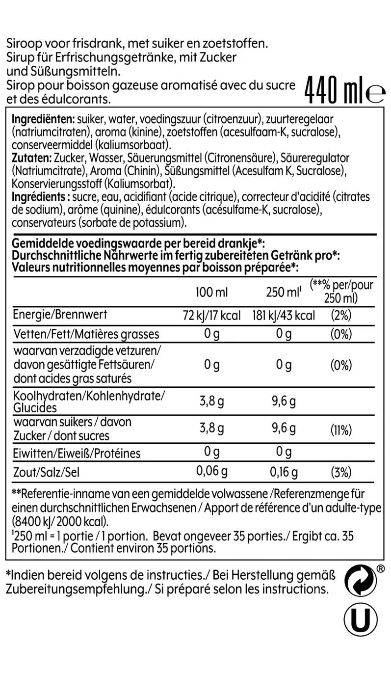 Met één fles siroop van SodaStream maak je maar liefst 9 liter bruisende drank, die je in een handomdraai vers bereidt. Meng de siroop met bruiswater in een SodaStream fles, en je hebt een heerlijk verfrissend drankje, klaar om van te genieten, waar je ook bent. Bekijk de ingrediënten en voedingswaarden in de voedingstabel voor meer details.